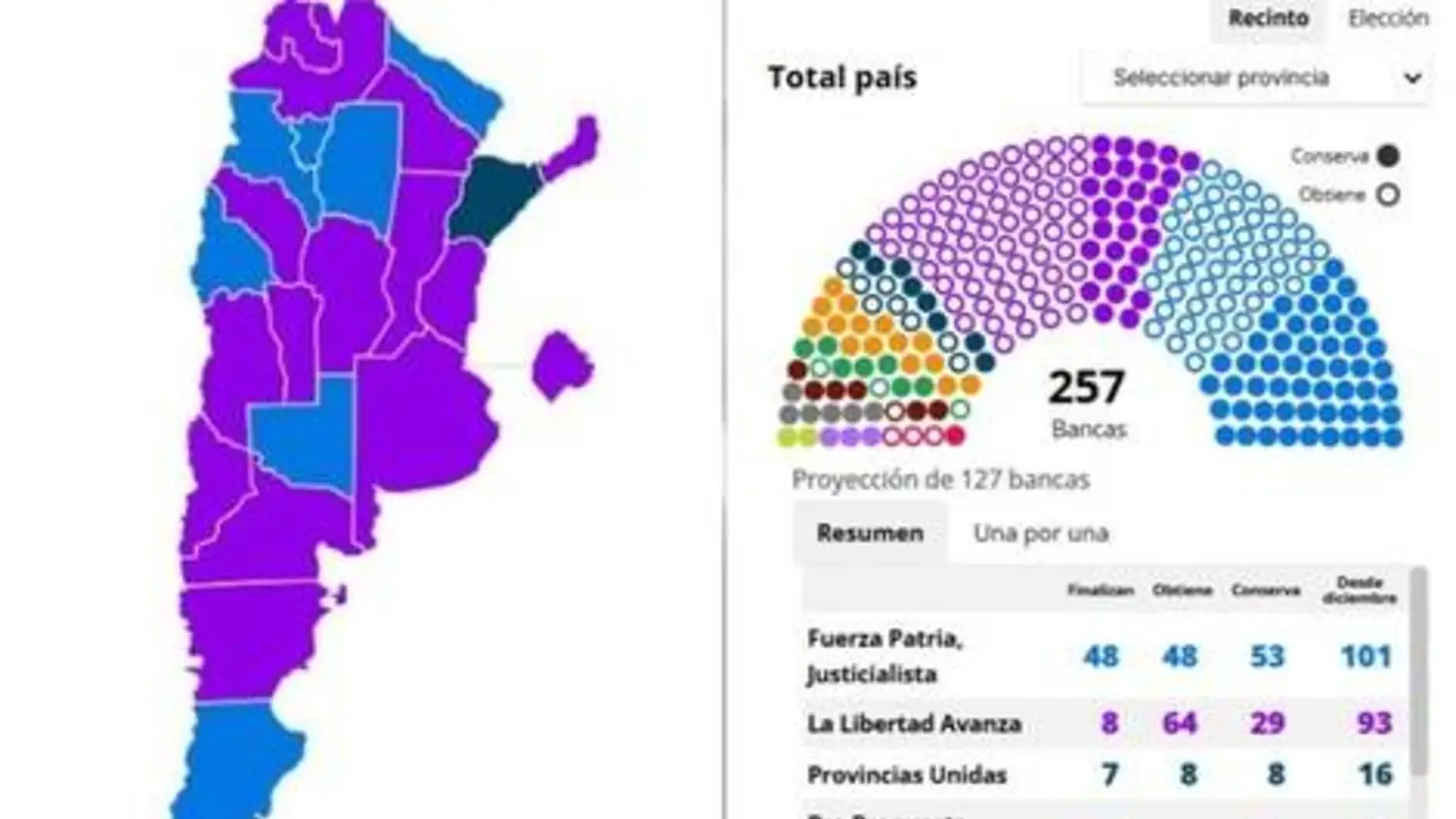 La Libertad Avanza (LLA) se impuso como la lista más votada en 15 de las 24 circunscripciones del país. En provincias como Mendoza, Entre Ríos y San Luis, LLA consiguió más del 50% de los apoyos. Fuerza Patria logró imponerse en otras ocho provincias, destacándose en distritos como Santiago del Estero, Formosa y Tucumán.